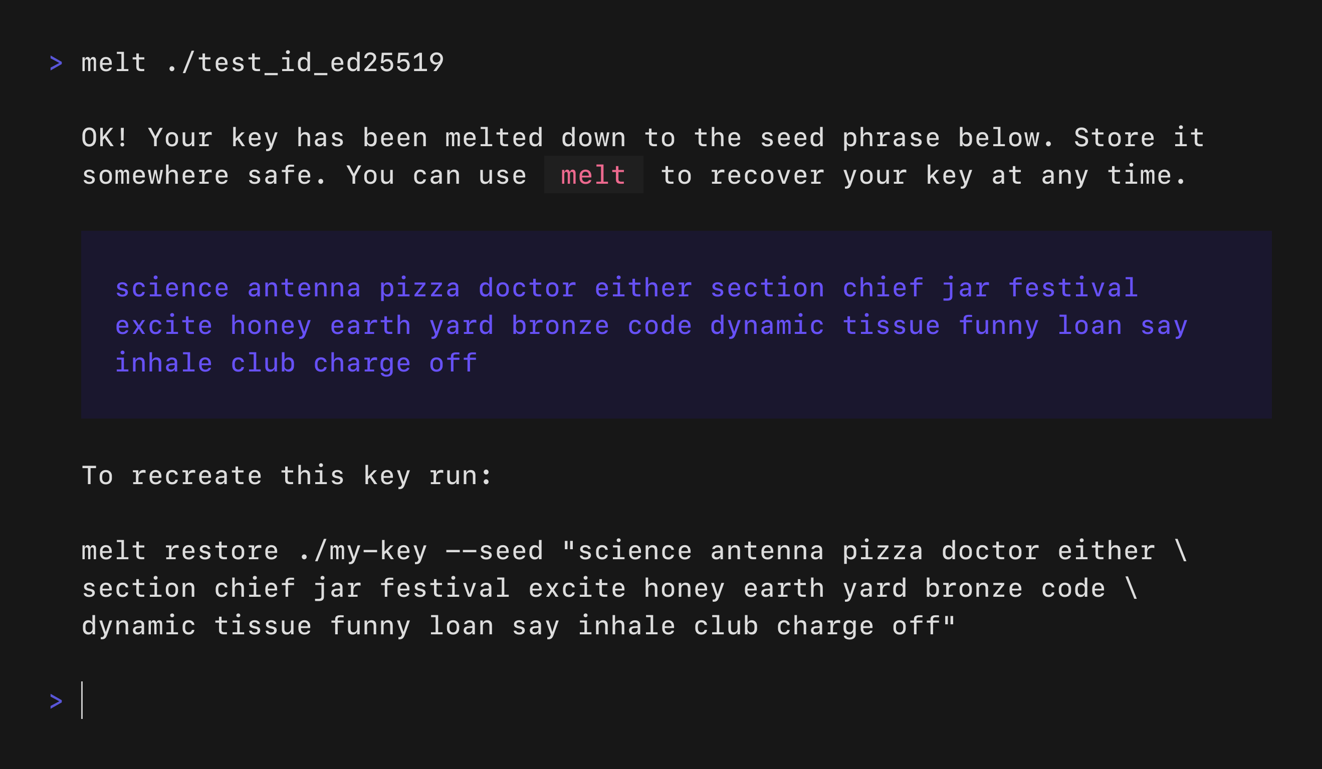 melt restore ./my-key --seed "seed phrase"