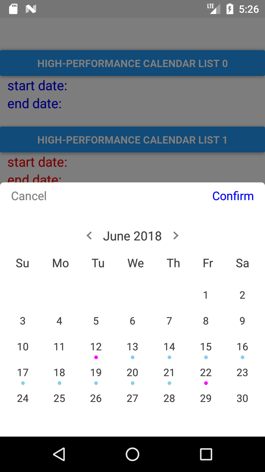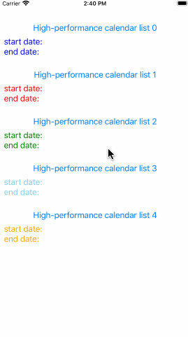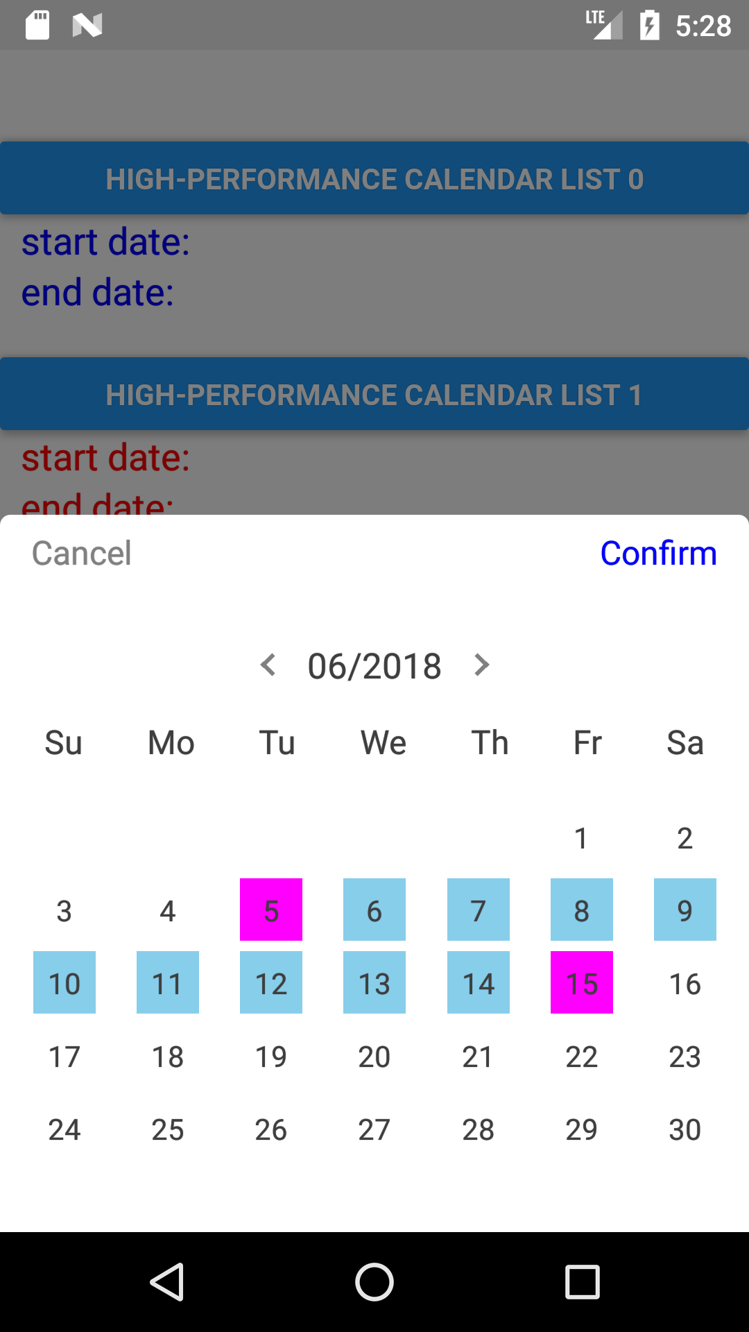 | selectedDateMarkRangeColor | string | Selected date mark background color between start date and end date. Default is 'skyblue'. |