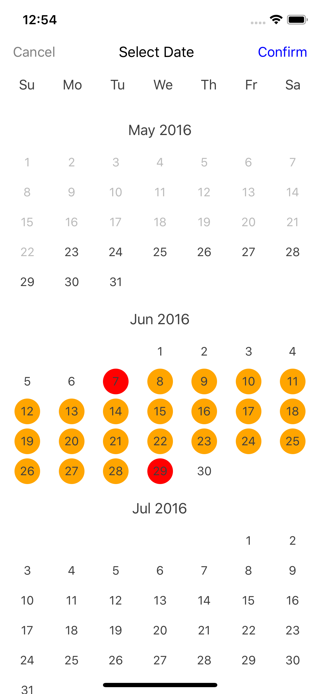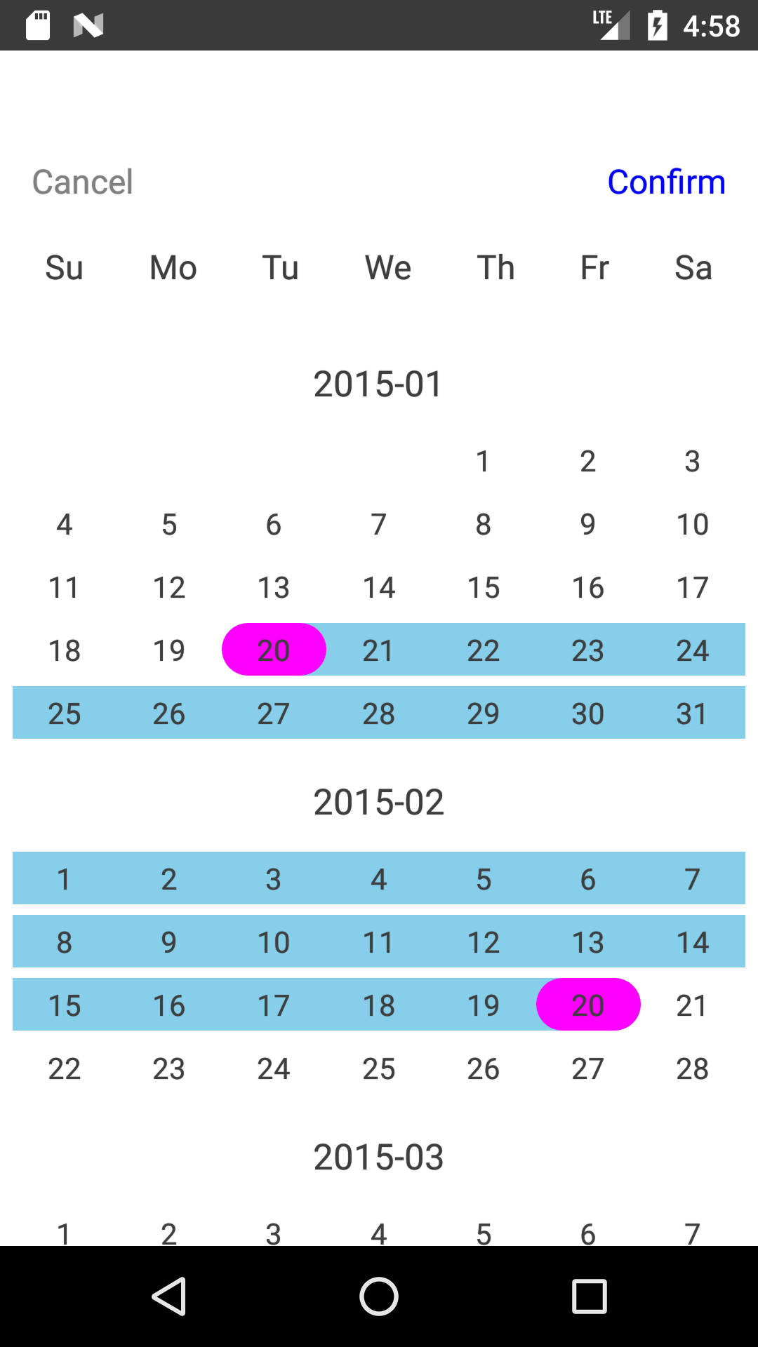 | confirm | function | tool bar confirm button callback with a date array like ["2016-01-09", "2019-09-18"]. "2016-01-09" is the start date(min date) you selected. "2019-09-18" is the end date(max date) you selected. If nothing is selected, the array's elements will be empty string like ["", ""]. |