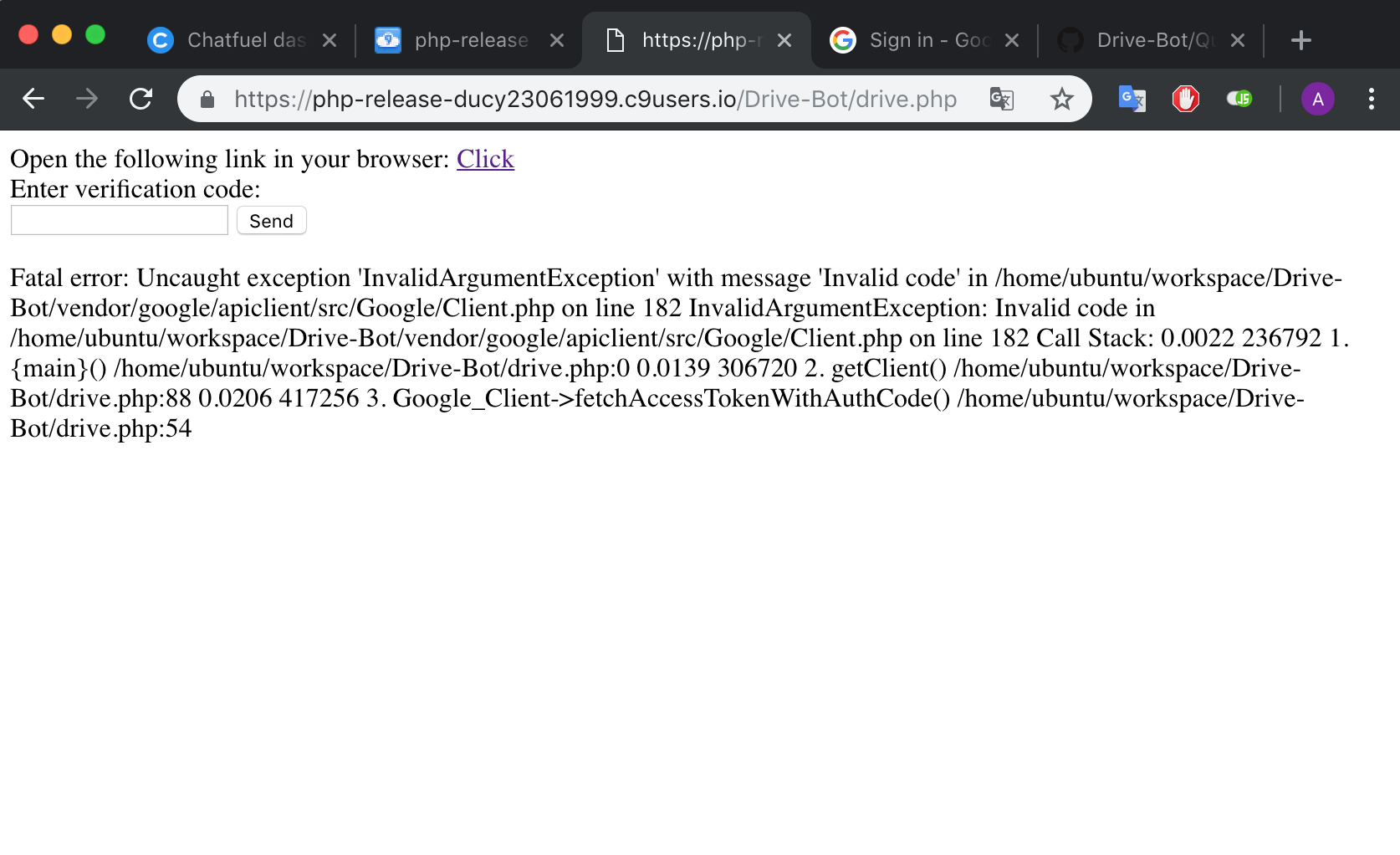 6. Truy cập url trỏ đến drive.php của bạn sau đó cài đặt đăng nhập vào tài khoản của bạn bằng click vào "click"