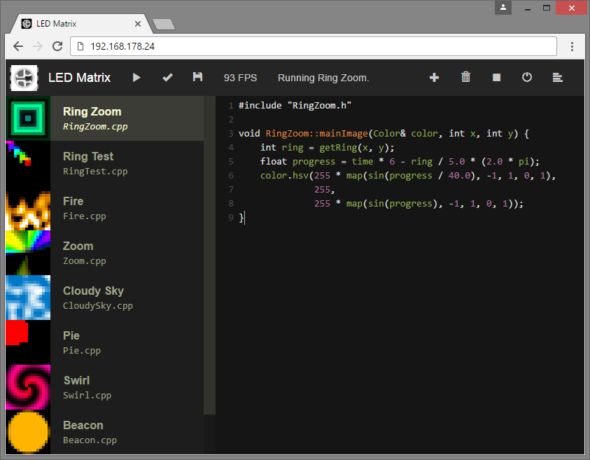 This project provides a web interface for a hardware 16x16 LED matrix where users can quickly and easily program simple animations which are then played on the LED matrix. The goal is to provide a similar experience to Shadertoy.